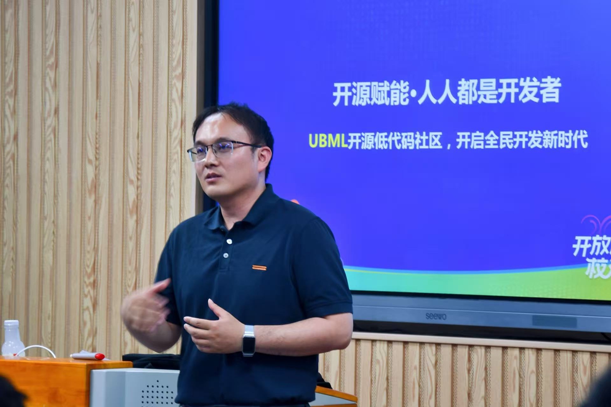 闫舒以“开源赋能·人人都是开发者”为题,详细阐述了开源与低代码概念,阐释低代码在开源生态中的独特作用,以搭积木式开发比喻,形象说明低代码便捷性,并现场演示UBML低代码开发环境,展示inBuilder社区丰富组件与模板资源。他结合相关开源竞赛,展示了UBML在各领域应用案例,并为同学们深入剖析了当前开源生态的机遇与挑战,结合实例生动讲解开源文化背后蕴含的协作创新理念,让同学们对开源的内涵与价值有了更深刻的认知。