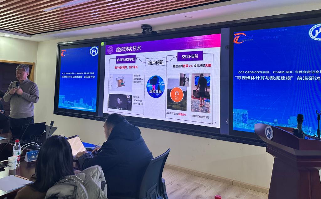 活动伊始,王敬政致开幕辞,对各位专委会专家的到来表示热烈欢迎和诚挚感谢,介绍了学校的历史沿革与发展现状,特别是学校近年来在人工智能、计算机视觉和多媒体等领域取得的科研成果及未来规划,表达了学校与CCF CAD&CG专委会、CSIAM GDC专委会深化合作的美好愿景。他强调,此次活动不仅为学校搭建了与全国顶尖学者面对面沟通的宝贵平台,也为计算机图形学及多媒体相关学科的发展创造了新的机遇。
