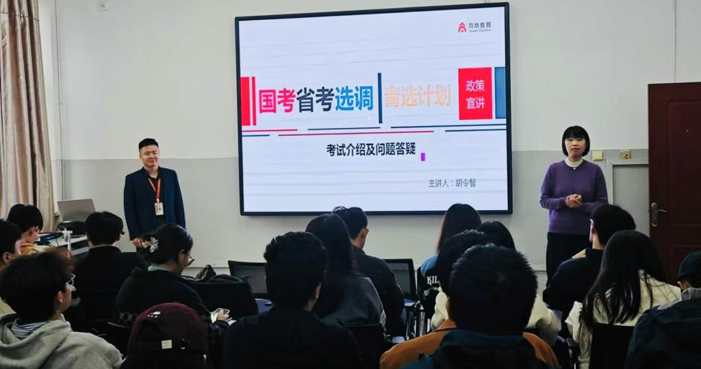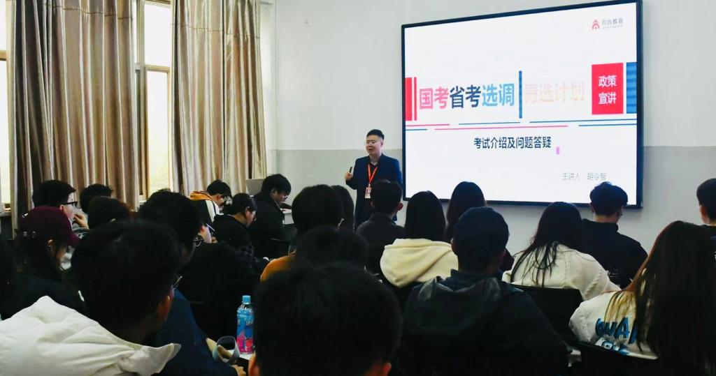 在燕山校区举办了国考、省考及青选计划公益讲座,邀请向尚教育讲师胡令智为高年级学生做考公方面的政策解读。来自大二至大四的50余名学生参加了本次讲座。讲座由正规博彩平台
