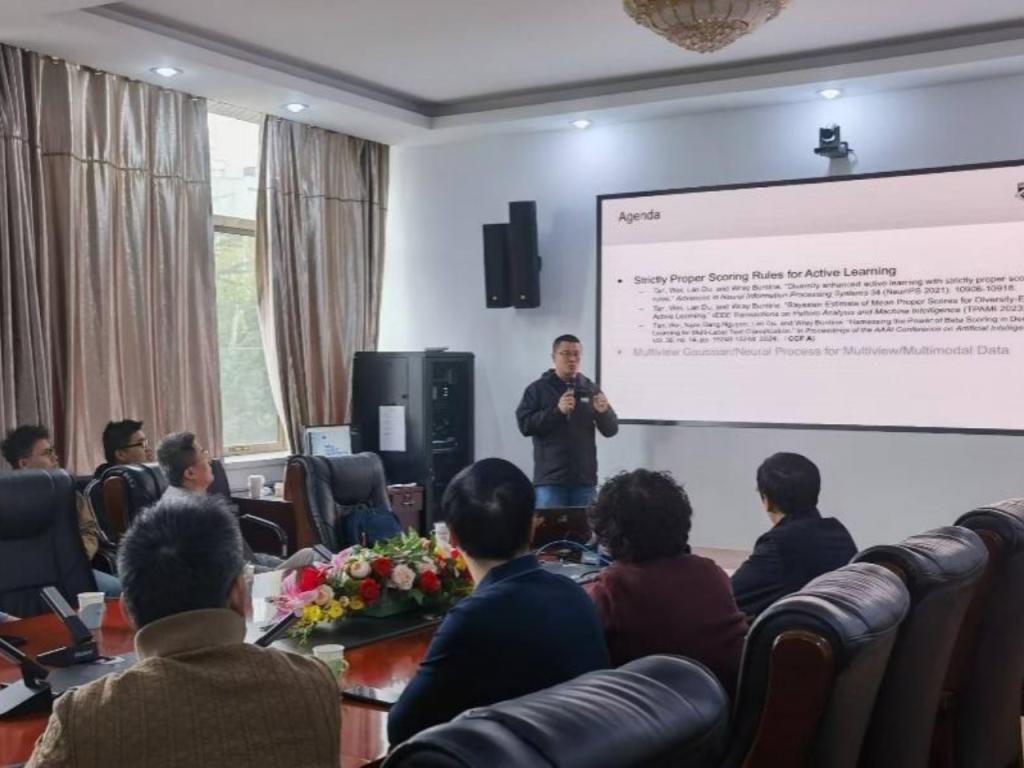在报告中,杜岚副教授分享了他在主动学习领域的最新理论研究。杜岚副教授团队将ELR框架转换为估计(严格适当)评分增加的函数,并将其命名为贝叶斯均值适当评分估计(BEMPS),通过借鉴MOCU的证明思路,成功证明了BEMPS的收敛性。为了更好地验证新获取函数的性能,其团队还开发了一个互补的批次主动学习算法,旨在提高未标注数据中预期评分变化向量的多样性。同时,还将集成方法和预训练语言模型上动态构建验证集相结合,以实现高性能的文本分类器。通过广泛的实验评估,团队发现使用BEMPS的均方误差和对数概率能够提供稳健的获取函数,并且在测试中始终优于其他方法。