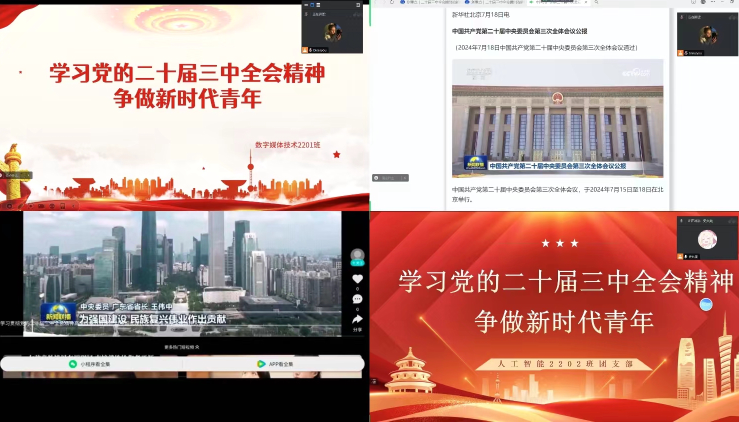各级团组织召开了以“学习党的二十届三中全会精神,争做新时代青年”为中心的主题团日活动,通过专题学习、研讨交流等形式,充分利用多媒体和数字化设备,多样化开展学习宣讲。数字媒体技术2201班团支部在支部书记亓琪的带领下,认真学习党的二十届三中全会内容,深刻领悟会议精神。支部团员就“教育、科技、人才是中国式现代化的基础性、战略性支撑”展开讨论,表示中国式现代化为我们提供了广阔舞台。亓琪鼓励同学们作为青年,要肩负时代重任,直面挑战,抓住机遇,以饱满的热情投身到国家建设和改革中,以青春之我创造青春之国家,为实现中华民族伟大复兴的中国梦不懈奋斗。