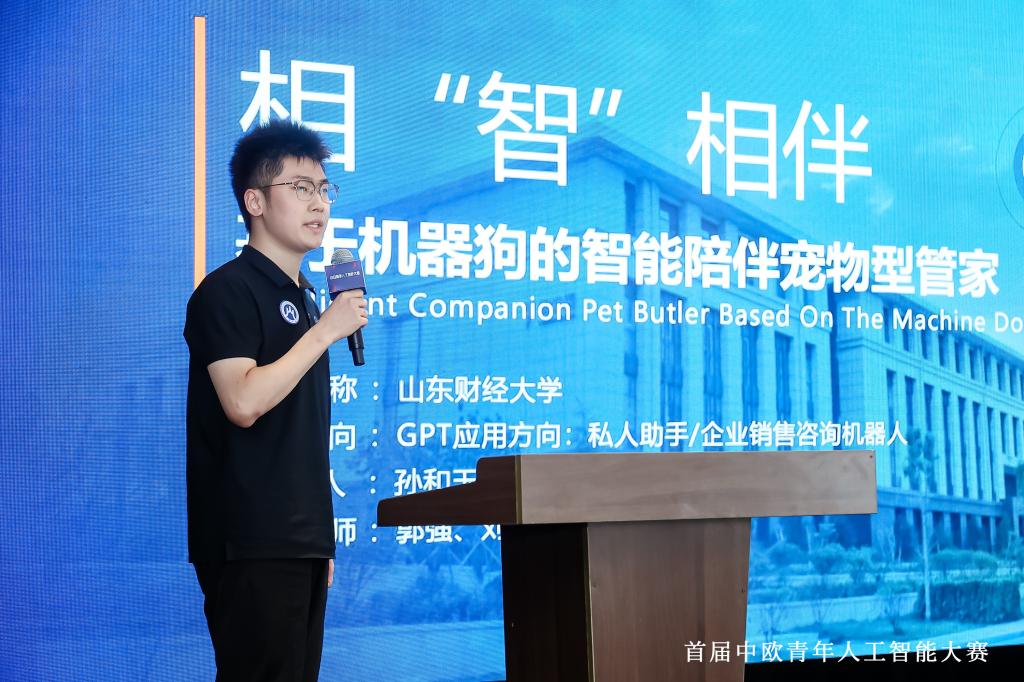 参赛作品《相“智”相伴——基于机器狗的智能陪伴宠物型管家》以总分第一的成绩荣获金奖。该团队是由郭强、刘薇和任楠三位老师共同指导,2021级计算机科学与技术(金融信息化)专业孙和玉作为队长,2022级人工智能专业王秀磊作为队员组成。作品面向独居人士群体,以端云结合为基础,结合CenterNet、OpenPose、NLP、语音交互,并以深度学习和人工智能为核心,以类波士顿四足机器狗为载体,研发了一款集情感交互、健康监测、心灵陪伴、摔倒监测为一体的程序自设、硬件稳固、交互完善的机器狗。
