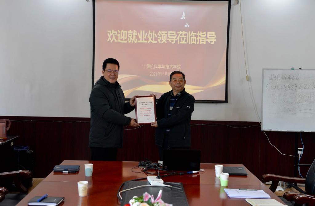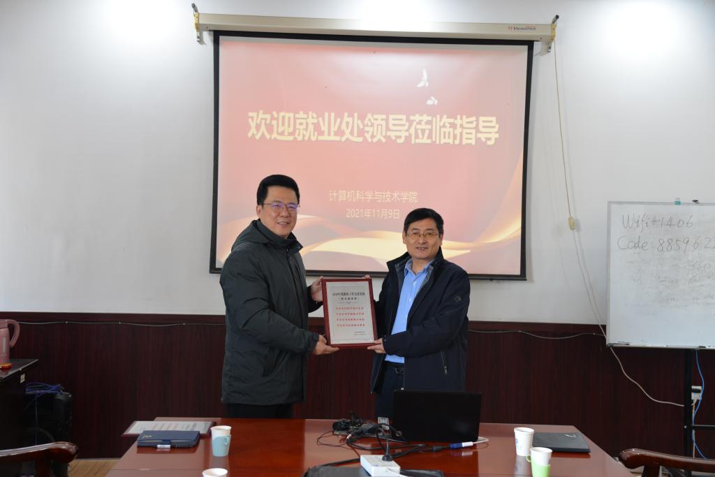 韩慧健表示学院始终高度重视毕业生就业工作,对就业处在全校就业精细化统计工作中的创新和付出,以及多年来对学院就业工作的指导和帮助表示由衷的感谢。他表示,此次就业处来访座谈带着荣誉奖杯而来,是对学院就业工作的肯定和认可。学院一直探索将荣誉和激励机制纳入各项工作之中,形成价值引导。下一步学院就业工作的重点将放在“练好内功”,进一步提升人才培养质量,依托“计算机文化节”等品牌活动,加强学生、学科、人才培养的对外宣传,吸引更多优质企业来院招聘;进一步加强产学融合,项目合作和转化,为学生职业能力提升和高质量就业提供更优质平台。