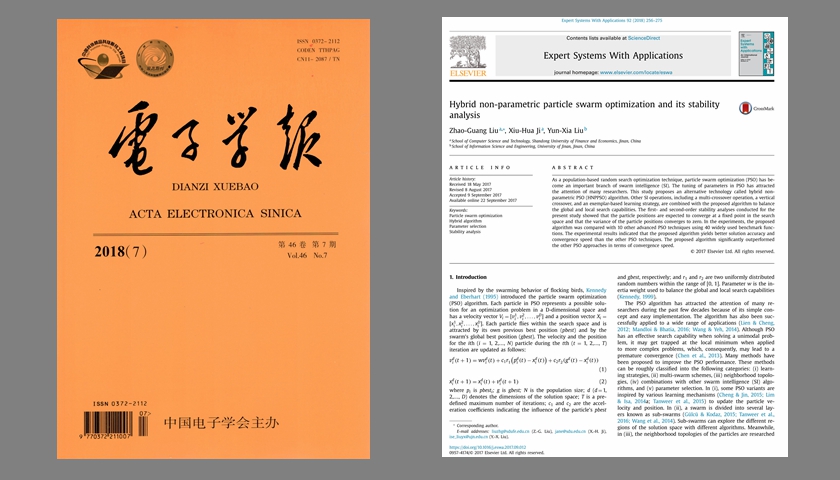 近日,正规博彩平台刘兆广副教授以第一作者身份分别在我校特类期刊《Expert Systems With Applications》上发表论文《Hybrid non-parametric particle swarm optimization and its stability analysis》,在A类期刊《电子学报》上发表论文《一种快速收敛的非参数粒子群优化算法及其收敛性分析》。主要研究成果如下: