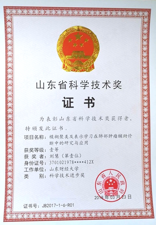 刘慧教授主持完成的“模糊聚类及表示学习在肺部肿瘤辅助诊断中的研究与应用”成果获山东省科技进步奖一等奖。这是我校首次获得省级科技类奖励一等奖,标志着我校在科研及其成果转化方面取得了新的突破。