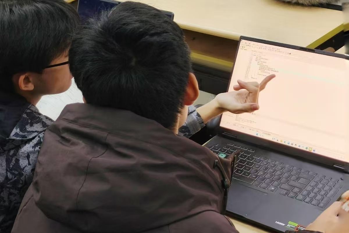 在自主解题环节,部分同学被一些难题“绊住了脚”,关键时刻,班内C语言学习情况较好的同学主动担当起“小老师”的角色。在一道关于二维数组与杨辉三角生成的题目上,不少同学对如何利用循环和数组操作来实现杨辉三角的正确输出存在困惑。学习成绩优异的翁汝毅便走到有疑问的同学身边,耐心地讲解杨辉三角的构造原理,从数组的初始化,到每行元素与上一行元素的关系,再到具体的代码实现步骤,一步步细致剖析。他还结合自己的代码演示,让同学们更直观地理解逻辑;在递归的一道题目当中,赵梓清为大家分步理解,让同学们能够了解到函数背后的逻辑,指出同学们在代码当中的错误并讲解多个方法解答问题,让同学们能够举一反三;全班同学们积极参与交流,遇到不同思路和解法时,大家围在一起热烈讨论,大家不仅找到了更优的解题方法,还加深了对C语言不同知识点应用场景的理解,原本困扰大家的难题,在集体的智慧下被逐一攻克。